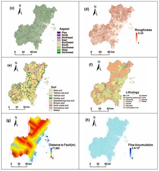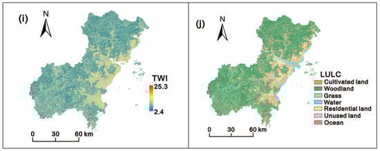 Thematic layers used for landslide susceptibility mapping of Wenzhou City: (a) elevation, (b) slope, (c) aspect, (d) roughness, (e) soil, (f) lithology, (g) distance to structures, (h) flow accumulation, (i) TWI, and (j) LULC.