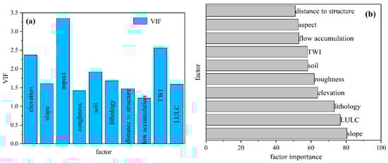 In this study, we focus on a variety of environmental factors relevant to landslide occurrences. The multicollinearity among the influencing factors is firstly assessed before training the machine learning model (Figure 7a). The results indicate that the aspect factor has the highest VIF at 3.35, followed by the TWI (2.56) and elevation (2.37). The remaining factors demonstrate VIF values around 1. Generally, a VIF value less than 10 suggests independence among the factors. This indicates that the conditioning factors used in the current study do not suffer from collinearity, and all of them can be incorporated into the subsequent landslide susceptibility assessment.