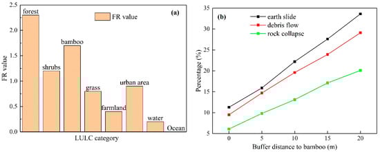 Relationship between bamboo and landslide distribution: (a) FR values of landslides in different LULC categories, and (b) percentage of landslides in the area with different buffer distances to bamboo, where three landslide categories are separated.