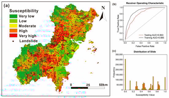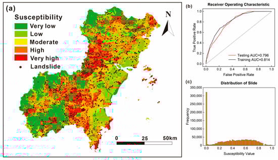Results of landslide susceptibility assessment based on random forest model: (a) landslide susceptibility map, (b) ROC accuracy of the model, and (c) distribution of susceptibility values for pixels.