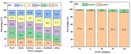 Intersection areas between LULC and landslide susceptibility maps: (a) Distribution of each susceptibility level within different LULC categories, and (b) percentage of bamboo areas within each susceptibility level.