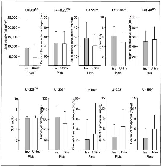 | Group | Coverage of P. indica | Light Intensity [cd × sr/m2] | Depth of Compact Soil Layer [cm] | Soil Electrical Conductivity [mS/cm] | Soil Moisture [0–10] | Height of Herbaceous Layer [cm] | Soil pH | Content of Nitrate [mg/kg] | Content of Amonium Nitrogen [mg/kg] | Content of Potassium [mg/kg] | Content of Phosphorus [mg/kg] |