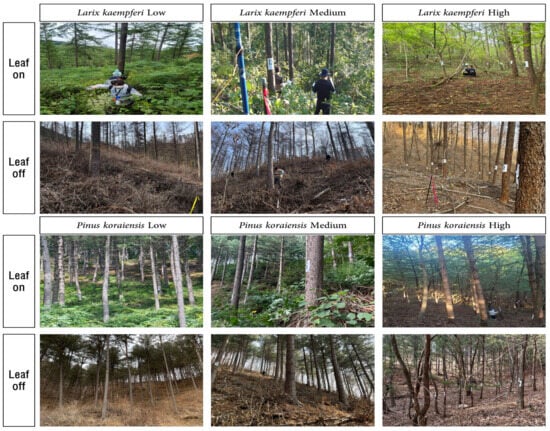 The datasets used in this study include field-based forest survey data and LiDAR-based indirect survey data, including TLS and BPLS. To assess the accuracy of the LiDAR data collected during the growing (August 2021) and dormant (March 2022) seasons, data were collected independently for each period (Figure 1). The target tree species were the principal coniferous species in Republic of Korea: Larix kaempferi and Pinus koraiensis. Six sample plots were selected based on species and stand density (low, medium, and high) to assess the differences in measurement outcomes according to stand density (Figure 2).