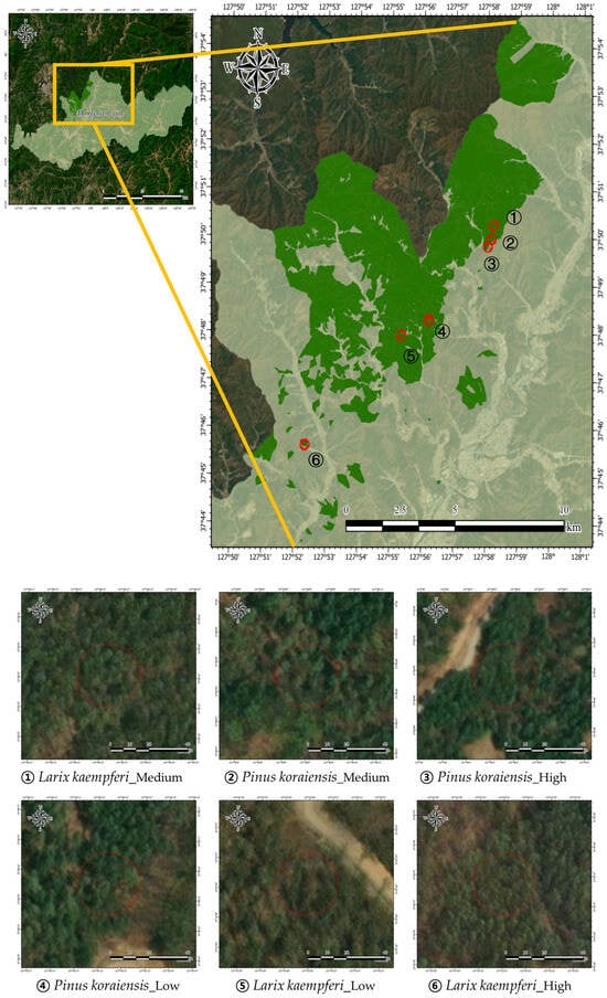This study focused on the Gari Mountain Forest Management Complex, located in Hongcheon-gun, Gangwon Province, Republic of Korea (37°49′49″ N, 127°58′1″ E) (Table 1). The study site was established as a circular sample plot with a radius of 16 m (approximately 0.08 ha), which was consistent with the National Forest Inventory (NFI) sample plot size in Republic of Korea. This sample plot was selected because of its representativeness of the typical forest conditions in the region, allowing for meaningful comparison and analysis.