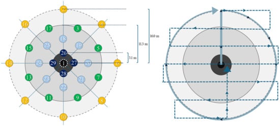 Tree-level data were collected using GNSS to georeference both the sample plots and individual trees. Identification tags were attached to each tree to facilitate data comparison. TLS data acquisition involved 29 scans to match the steep and dense conditions of the sample plots and improve data precision, while BPLS scanning followed a similar procedure. Utilizing multiple scans enhanced the accuracy and reliability of the LiDAR data, allowing for a detailed analysis of tree- and stand-level characteristics. As shown in Table 2, the study site is characterized by steep slopes and high stand density, resulting in a large number of individual trees. To minimize occlusion among trees, a total of 29 scans were performed. Methods utilizing TLS are known to experience challenges related to occlusion effects caused by surrounding trees, which hinder accurate measurement of the target trees [29]. Occlusion occurs when parts of the trunk, branches, or leaves obstruct the line of sight, preventing the scanner from capturing the rear portions of the object. Since TLS data acquisition involves scanning from multiple positions and aligning the datasets, issues such as occlusion effects, omission errors, and commission errors are common, leading to reduced data accuracy. Previous studies have reported that 10%–32% of trees within a sample plot may remain unscanned from the center due to obstruction by neighboring trees closer to the LiDAR device [15,17]. To mitigate these issues, scans must be conducted from multiple positions within the plot to minimize errors and improve data quality (Figure 3).