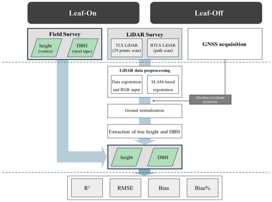 LiDAR data were processed using both pre- and post-processing steps (Figure 4). The pre-processing included data registration, inputting RGB values into the point cloud, and converting the relative coordinates to absolute coordinates. For TLS, pre-processing was performed using Leica Cyclone REGISTER 360 software (Leica Geosystems, ST. Gallen, Switzerland) [27] to align the 29 scans and input RGB values. The relative coordinates of the LiDAR data were converted to absolute coordinates using the GNSS data. In the case of BPLS, the SLAM technology integrated into the equipment allowed automatic path alignment during data acquisition; therefore, no additional pre-processing was required. The GNSS data were used to match the georeference with the TLS data. Due to interference from the tree canopy, GNSS signals were not consistently acquired. To address this, a tethering connection with a smartphone was utilized during the data collection process. Furthermore, data were continuously collected from the forest road to the plot locations, and coordinates were recorded once the positional error was confirmed to be within 1 m.