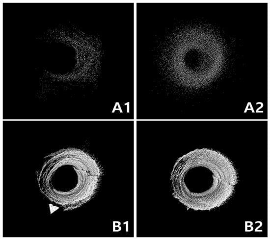 Differences in trunk occlusion due to understory vegetation between growing and dormant seasons (A1: BPLS_Leaf-On; A2: BPLS_Leaf-Off; B1: TLS_Leaf-On; B2: TLS_Leaf-Off).