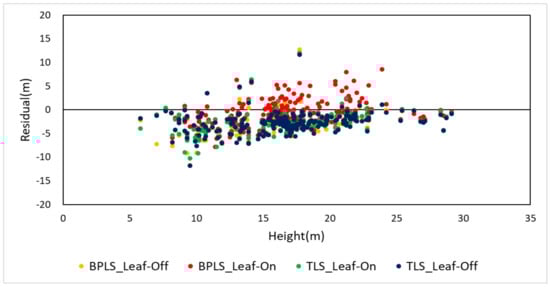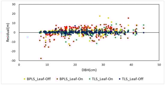 Consequently, DBH is measured directly by workers using a diameter tape, resulting in highly accurate field survey data. When residual plots were drawn by comparing DBH and tree height from field surveys, tree height showed a greater range of differences than DBH (Figure 8 and Figure 9). When comparing the equipment, TLS had fewer residuals than BPLS. In terms of seasonal comparison, the growing season had higher residuals than the dormant season. The lower accuracy of BPLS and TLS for tree height measurements compared to DBH was due to the field survey method using a Vertex hypsometer, which is more sensitive to user variability, stand conditions, crown width, and tree species compared to LS methods [37]. Additionally, tree height is generally more difficult to measure directly than DBH in dense stands because of the influence of neighboring trees. Tree height measurements using the LS equipment showed lower accuracy because fewer points were obtained at the treetop. Therefore, tree height is more affected by stand density and the timing of scanning than DBH. Bauwens et al. [29] also reported that most laser signals have difficulty acquiring heights of 15 to 20 m. Figure 9 shows that many trees are distributed in the 20 to 30 m range. In particular, BPLS showed the largest residuals during the growing season, indicating a significantly lower accuracy for tree height measurement during the growing season.