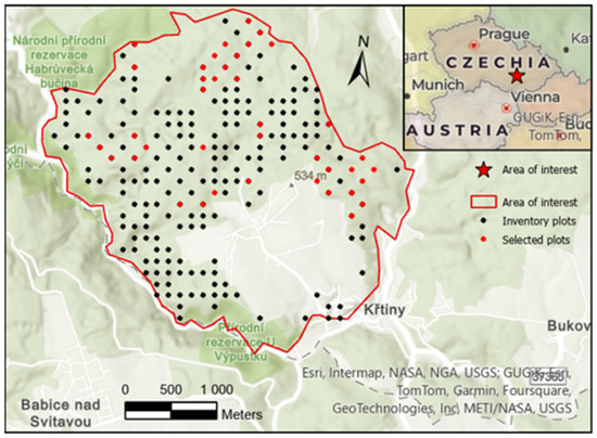 The research area was situated in the southeastern region of the Czech Republic (49°25′ N, 16°68′ E) within the University Forest Enterprise “Masaryk Forest” Křtiny (a special purpose utility of the Mendel University in Brno), specifically in the Habrůvka forest district. The site experiences a mean annual temperature of 7.5 °C and receives mean annual precipitation ranging from 550 to 650 mm. Throughout the entire area, a gradual transition from clear-cutting to shelterwood management has been taking place over the past 20 years. In 2002, a total of 270 concentric inventory plots were established to enable the monitoring of the production parameters of forest stands, mainly the current volume increment. From these, a pool of 200 plots on nutrient-rich (mesotrophic) sites was taken. From this pool, we randomly selected and remeasured 40 plots (Figure 1) for further analyses in 2021. Plots were chosen randomly, using the local pivotal method (LPM) implemented through the BalancedSampling package in R [42]. The selected set of 40 plots covers the full spectrum of transition phases from clear-cutting to shelterwood management.