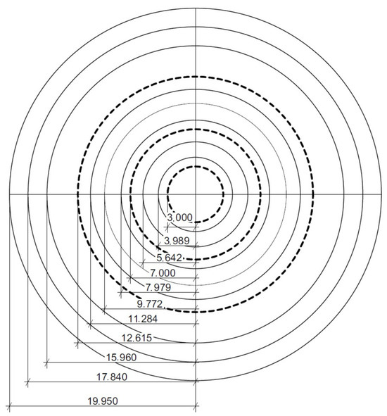 When this procedure is applied to the CC plot design, the inclusion indicator of a tree in the plot I = 1 is divided by the area of the inventory circle on which it was registered. This relationship is expressed by the equation , where is the inclusion indicator of a tree, taking the value 1 for inclusion and 0 for non-inclusion, and is the area of the inventory circle on which the tree is registered. In the case of a tree registered on a circle with r = 3 m, the tree’s contribution to the local tree density per hectare is 354. For a circle with a radius of 7 m, it is 65, and for the largest circle with a radius of r = 12.616 m, it is 20. To ensure compatibility with data from fixed-radius plots, the inclusion indicators of individual trees were also recalculated as contributions to the local tree density per hectare by dividing by the corresponding area of the inventory circle (Table 2).