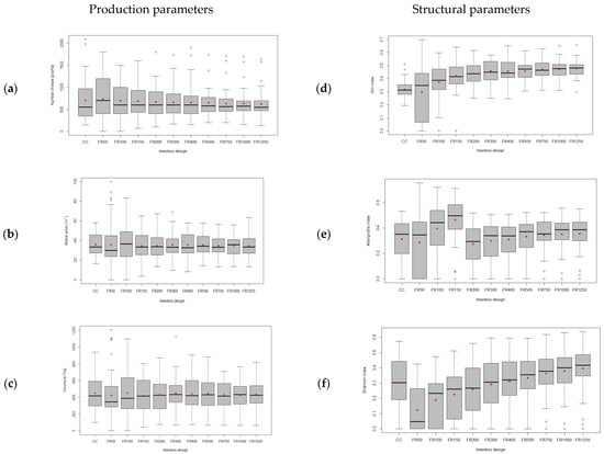 Final estimates of production and structural parameters resulting from evaluated designs. Explanations for boxplots: estimates of (a) number of trees per hectare, (b) basal area, (c) standing volume, (d) Gini index, (e) Artenprofile index, (f) Shannon index. Grey rectangle—range between the 25th and 75th percentiles; horizontal bold line dividing the grey rectangle—median; red dot—arithmetic mean; whiskers—they extend to the most extreme data points that are within 1.5 times the interquartile range (IQR) from the lower (25th percentile) and upper (75th percentile) quartiles; points outside the whiskers—outliers.