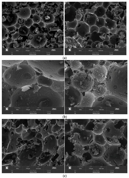 Comprehensive thermal analysis of four foam samples was conducted using a thermogravimetric analyzer (STA449F, Netzsch, Germany) with a temperature range of 0 to 500 °C, a nitrogen flow rate of 20 mL/min, and a heating rate of 10 °C/min. The true density was determined using an automated true density analyzer (3H-2000 TD1, Best Instrument Technology Co., Ltd., Beijing, China) employing the gas expansion method at a measurement temperature of 25 °C, with helium as the test gas. The contact angle of the foams was measured using a contact angle measuring instrument (C2000C1, Shanghai Zhongchen Digital Technology Equipment Co., Ltd., Shanghai, China). Water droplets, with a volume of approximately 5 μL and a diameter of 1 to 2 mm, were applied to the solid surface using a microsyringe. Each sample was measured 10 times, with each droplet being measured continuously for 10 times at intervals of less than 2 s, ensuring the total measurement time did not exceed 1 min. The water absorption rate of the foams was determined in accordance with the Chinese National Standard GB/T 8810-2005 [35].