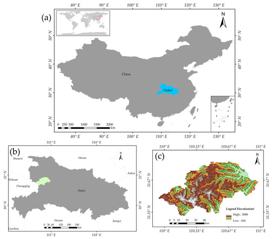 Location of the study area. (a) The location of Hubei Province in China, (b) the location of the Shennongjia Forest District in Hubei Province, and (c) the elevation of the Shennongjia Forest District.