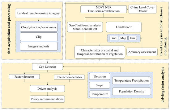 Specifically, we will explore the following questions: (1) How has vegetation disturbance changed over time in the study area? (2) How have vegetation disturbance patterns changed? (3) What are the main drivers of vegetation disturbance? The results of this study will provide a new research paradigm for the protection and sustainable use of forest vegetation.