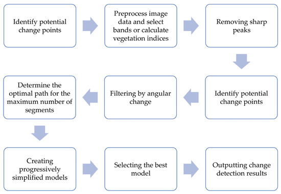 This mainly includes the following processes (Figure 4): (1) Remove noise interference. (2) Identify potential segmentation points. (3) Fit the spectral trajectory. (4) Simplify the model and select the best model. The algorithm fits the spectral indices of each pixel within the time series, selects the most suitable regression model to segment the time series through the p-value test of F-distribution, and extracts the trend of the indices over the time series. Spectral Temporal Segmentation Algorithm-LandTrendr has been widely used to analyze and detect time series variations in medium-resolution satellite imagery, but it requires a lot of preprocessing, data management, and computational resources. GEE has simplified the steps to implement the Spectral Temporal Segmentation Algorithm in GEE, and in this paper, we use the APIs provided by LT-GEE for detection (https://github.com/eMapR/LT-GEE, accessed on 12 January 2024.). The parameter settings are shown in Table 3.