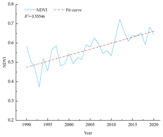 Annual variation of mean NDVI in the study area from 1990 to 2020.
