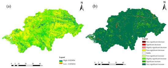 where 1 < i < j < n, i, j is the number of time series; n is the length of the time series; and Xi and Xj are the normalized vegetation indices of year i and j, respectively. When β is greater than 0, it indicates the existence of an upward trend, and when it is less than 0, it indicates the existence of a downward trend.