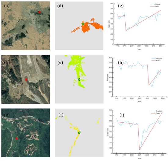 (a–c) are Landsat images; (d–f) are the disturbance years detected by the LandTrendr algorithm; (g–i) are for fitting NBR disturbance trajectories. The red markers on the left correspond to the green markers in the center, and each row is a set of images showing sampling points for low, medium, and high vegetation cover, respectively. Note: the sampling points marked in the figure are also the points used to fit the perturbation trajectories.