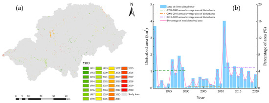 (a) Year of disturbance; (b) inter-annual variation characteristics of forest disturbance in Shennongjia Forest District from 1990 to 2020.