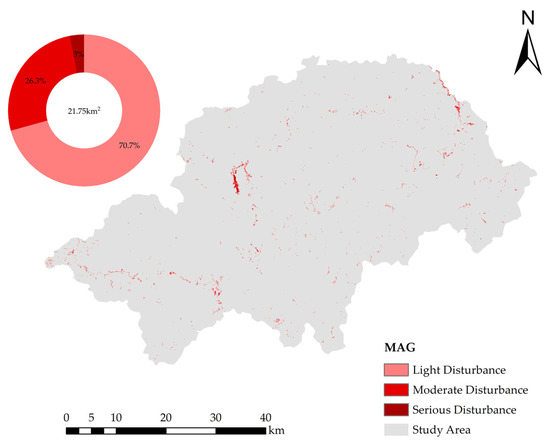 The interference intensity in this area is divided into three levels: light interference (200–400), moderate interference (400–600), and severe interference (>600). As shown in Figure 9, from the perspective of spatial distribution, the overall interference intensity in this region presents obvious regional differences. The disturbance intensity in the western region is relatively low, mainly light disturbance and moderate disturbance, which shows that the vegetation in this region is relatively stable. In contrast, the northwestern and eastern regions showed a more pronounced moderate disturbance, which may be related to the natural environment, human activities, or other factors in these regions. In addition, the forest change area under different disturbance levels was also analyzed, and the results showed that the proportion of mild disturbance to moderate disturbance was 0.70:0.26:0.03, the vegetation in this region was affected to a certain extent, and only a few areas were strongly affected by external disturbance.