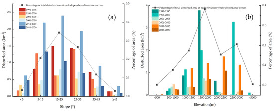 Area of forest disturbance at different elevations and slopes in Shennongjia Forest District: (a) slope and (b) elevation.