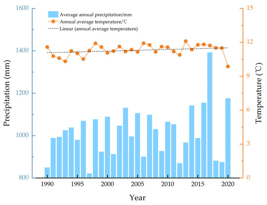 The average annual temperature and average annual precipitation of Shennongjia Forest District were analyzed for the period 1990–2020. As shown in Figure 11, from early 1990 to 2000, precipitation gradually increased, remaining between 800 mm and 1000 mm; after 2000, precipitation fluctuated more, but generally remained between 1000 mm and 1400 mm; in 2017, precipitation reached a peak, exceeding 1400 mm; and in 2020, precipitation decreased significantly, falling back to nearly 1000 mm. Throughout the time period, the mean annual temperature remained between 11 °C and 13 °C, with small variations. The temperature data show a relatively smooth trend, with no obvious upward or downward trend. The smooth trend in temperature indicates that the temperature change in the region was relatively stable during this 30-year period, with no obvious signs of long-term climate warming or cooling.