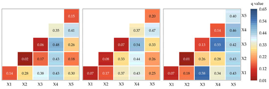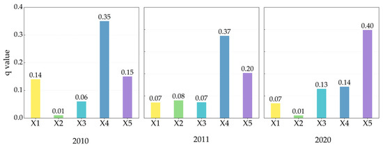 Factor detector. Note: from left to right, 2010, 2011, and 2020. X1, X2, X3, X4, and X5 represent annual average temperature, average annual precipitation, slope, elevation, and population density, respectively.