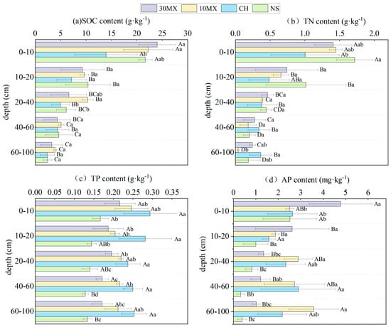 Nutrient content of different soil layers in four restoration models. 30MX: 30-species mixed plantation; 10MX: 10-species mixed plantation; CH: Castanopsis hystrix; and NS: natural recovered shrubland. Different uppercase letters indicate that there are significant differences among different soil layers in the same restoration model (p < 0.05); different lowercase letters indicate that there are significant differences among different restoration models in the same soil layer (p < 0.05).