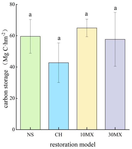 Soil carbon storage of four restoration models. Different lowercase letters indicate that there are significant differences among different restoration models (p < 0.05).