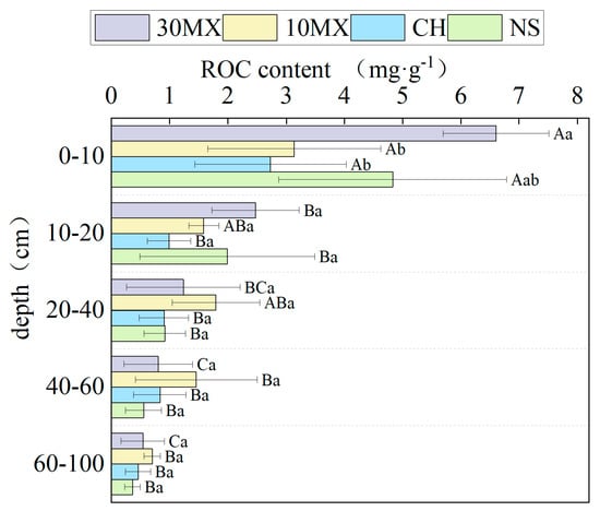 Soil ROC content in four restoration models. Different uppercase letters indicate that there are significant differences among different soil layers in the same restoration model (p < 0.05); different lowercase letters indicate that there are significant differences among different restoration models in the same soil layer (p < 0.05).
