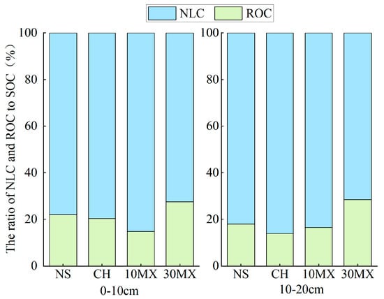 Since the differences in ROC contents among the restoration modes were only found in the top soil layer, a comparative analysis of the ratios of ROC and NLC to SOC was conducted for the 0–20 cm soil layer (Figure 4). The ratios of ROC to SOC in the first soil layer (0–10 cm) were 30MX > NS > CH > 10MX, and that of 30MX was significantly higher than 10MX. In the second layer (10–20 cm), the ROC:SOC was ranking as 30MX > NS> 10MX > CH, and 30MX was significantly higher than the other restoration models (Figure 4). In 0–20 cm soil, CL and CLI of 30MX were the largest, and that of NS was second (Table 3). However, in the 20–100 cm soil, the CL and CLI values of NS were the smallest among the four restoration modes. CPI and CMI of 30MX were the highest in 0–10 cm soil. Except for the 40–60 cm soil layer, the CPI and CMI of CH in the other soil layers were the minimum. CPI and CMI of 10MX were the highest in deep soil (20–100 cm, Table 3). It is worth noting that in the 40–60 cm soil layer, the CL, CLI, and CMI values of 10MX were the highest, not only higher than other models in the same soil layer, but also higher than other soil layers of 10MX.