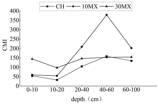 Two-way ANOVA showed that the restoration model had significant effects on soil SWC, NH4+-N, SOC, TP, pH, ROC, CPI, C:N, C:P, and N:P. Soil depth significantly affected most of the soil physicochemical property indicators, but did not cause significant effects on TP, AP, and CL. The interaction between restoration mode and soil depth had significant effects on soil NH4+-N, AP, ROC, and C:N (Table 4). Soil depth significantly affected soil CPI and CMI, and in a 1 m soil profile, the CMI of 10MX and CH showed a trend of decreasing then increasing, and then decreasing with increasing soil layer depth (Figure 5).