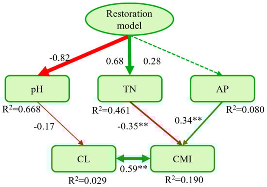 Structural equation model. χ2 = 2.594, df = 3.000, χ2/df = 0.865, p = 0.458, CFI = 1.000, GFI = 0.978, RMSEA = 0.000, and AIC = 604.030. Numbers on arrows indicate standardized path coefficients; ** indicates extremely significant paths; dashed lines indicate indirect effects, solid lines indicate direct effects; thickness of arrows indicates effect size; one-way arrows indicate regression analysis, two-way arrows indicate residual correlation. The red arrow indicates that the impact is negative, and the green arrow indicates that the impact is positive. TN: total nitrogen; AP: available phosphorus; CL: carbon lability; and CMI: carbon pool management index.