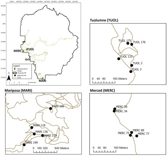 Location of giant sequoia (Sequoiadendron giganteum (Lindl.) J. Bucholz) groves within Yosemite National Park (top left), with inset maps of MARI (bottom left), TUOL (top right), and MERC (bottom right), which each include names and locations of trees sampled and formal trails within the groves.