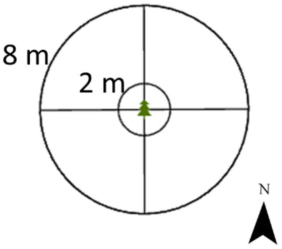Plot design for 2 m and 8 m radius tree plots with four subplots at each radius.