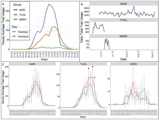 (A) Trail counter results showing hourly trail use within each giant sequoia (Sequoiadendron giganteum (Lindl.) J. Bucholz) grove at Yosemite National Park. All three groves (MARI, TUOL, MERC) had significantly different trail usage (p < 0.5). (B) Trail counter results showing daily total trail usage within each grove for weekdays (blue) and weekends (red, Fri–Sun). (C) Trail counter results showing hourly average trail use within each grove for weekends compared to weekdays. Points are means ± 1 SD. Significant differences between weekday and weekend use are denoted by an *.