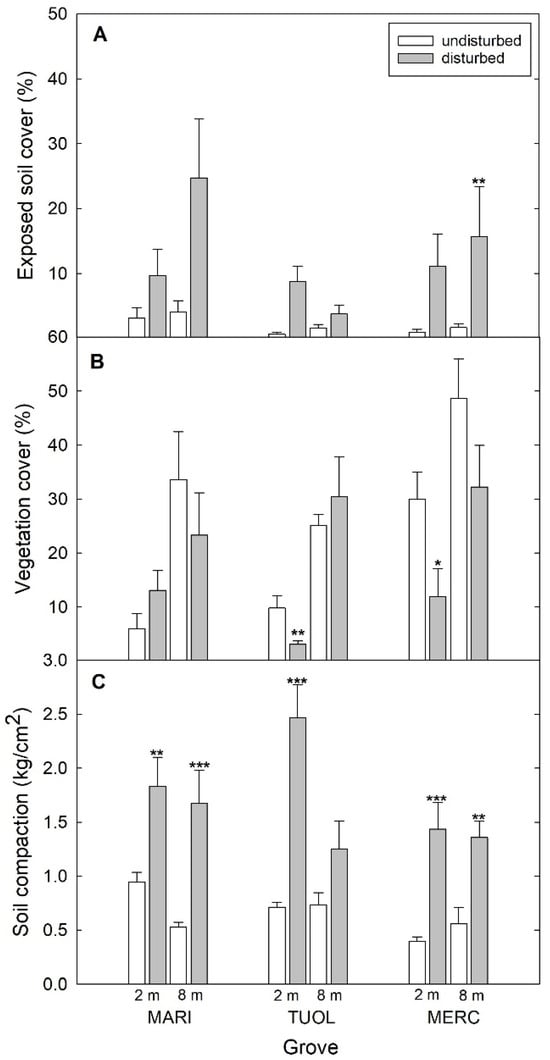 Exposed soil percent cover data (A), vegetation percent cover (B), and soil compaction (C) for trampling undisturbed and trampling disturbed plots at 2 m and 8 m distances ± 1SD within giant sequoia (Sequoiadendron giganteum (Lindl.) J. Bucholz) groves (MARI, TUOL, MERC). For MARI and MERC, plots were considered disturbed if anthropogenic disturbance percent cover was estimated at 5% or greater, whereas in TUOL, plots were considered disturbed if anthropogenic disturbance percent cover was estimated at 2.5% or greater. There were too few disturbed plots in TUOL when using the threshold of greater than 5% anthropogenically disturbed area. Significant differences between pairs (i.e., 2 m or 8 m) are represented by * such that * < 0.05, ** ≤ 0.01, *** ≤ 0.001.