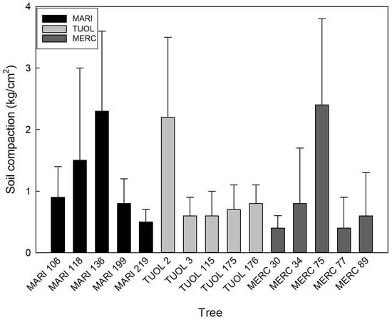 Average soil compaction ± 1 SD (kg/cm2) across all 8 subplots around a given tree within each giant sequoia (Sequoiadendron giganteum (Lindl.) J. Bucholz) grove (MARI, TUOL, MERC, n = 24).