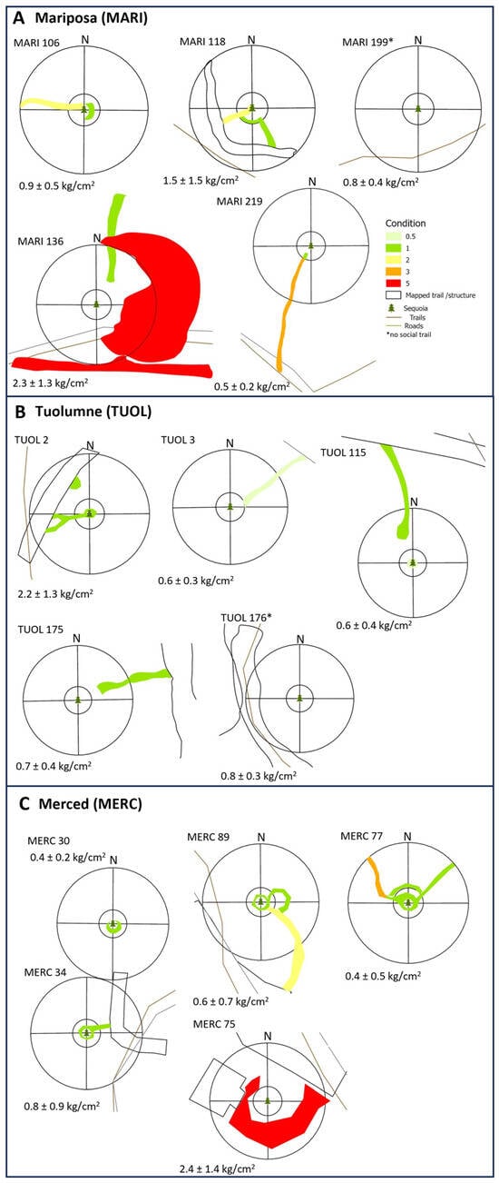 Trevor Denson, Alexis Klopack, and Kyle Ricio assisted with fieldwork. The authors thank Kane Russell and SEGI inventory volunteers for providing additional field data on social trails during their annual sequoia inventory monitoring. The authors also thank Garrett Dickman for discussions about impacts to giant sequoia and previous studies and Trevor Denson for providing GIS support and insight about similar methodology in coastal redwoods. We give special thanks to the Physical Science and Landscape Ecology Branch at Yosemite National Park for logistical support. Thank you to the UCNRS Yosemite Field Station for their support with scholarly coordination and park resources (doi:10.21973/N3V36C).