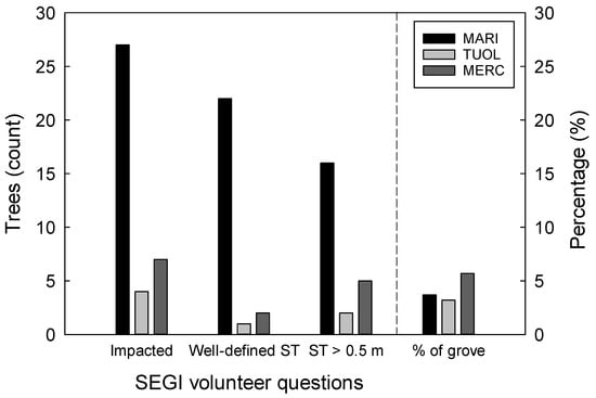 MARI had the most impacted trees (25), followed by MERC and TUOL (Figure 7). Analysis of SEGI volunteer–inventory data revealed MARI also had the most trees with social trails that were deemed as well-defined and with a portion exceeding 0.5 m width. However, proportionally, more mature trees were impacted in MERC (6%) relative to TUOL (3%) or MARI (4%). When considering all sequoia trees within a grove, less than 7% of the trees within a grove were impacted by social trails, regardless of grove.