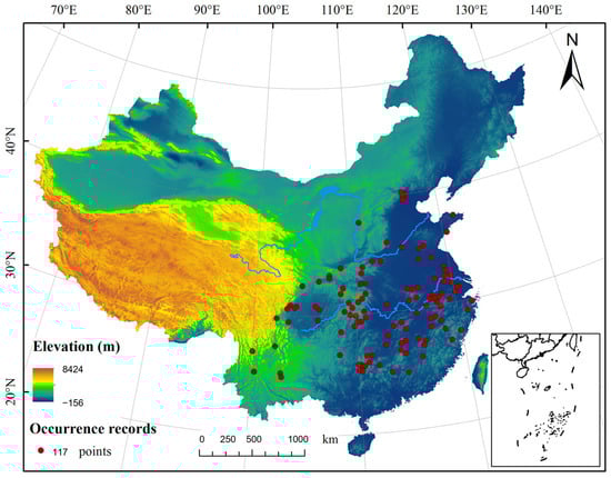 Ginkgo biloba L. distribution data were obtained from several sources, including the Global Biodiversity Information Facility (GBIF), the Chinese Digital Herbarium (CVH), and the Chinese National Specimen Resource Platform (NSII). The locations of Ginkgo biloba L. were extracted from these databases, and latitude and longitude data were collected using the Baidu coordinate system. After eliminating duplicates and invalid data, the buffer method in ArcGIS was used to retain one distribution point within a 5 km radius, resulting in 117 valid distribution data points(Figure 1).