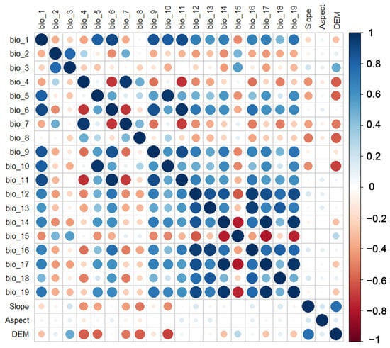 To avoid overfitting the model due to correlations between environmental factors, the distribution data and environmental variables were input into the MaxEnt model for pre-modeling. This process identified the contribution rates of each environmental factor and excluded those with a contribution rate of zero. Pearson correlation analysis was then performed on all environmental factors using SPSS 25.0 (Figure 2). Based on the correlation analysis and the table of environmental factor contribution rates, factors with |r| < 0.8 were retained, while factors with |r| > 0.8 were retained only if they had high contribution rates. This final selection yielded 11 environmental factors for modeling (Table 1). A correlation heat map of these environmental factors was plotted using the corrplot package in R.
