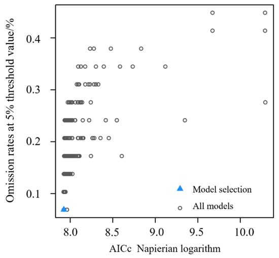 Given that the MaxEnt model can become overfitted due to complex operations, resulting in unreliable or difficult-to-interpret predictions, model complexity was addressed. Complexity is significantly correlated with the feature combination (FC)—LQPTH (L = linear, Q = quadratic, P = product, T = threshold, H = hinge)—and the regularization multiplier (RM) []. Therefore, the MaxEnt model was tuned using the “kuenm” package (R3.6.3) to ensure optimal combinations of RM and FC parameters. The best parameter combination was selected when the omission rates were less than 5% and the natural logarithm of AICc was minimized, corresponding to a delta AICc value of zero.