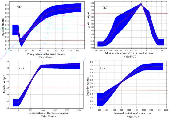 MaxEnt model outputs and regularized training gain contributions, based on the Jackknife test and one-way response curves, revealed the key environmental factors influencing Ginkgo biloba L. distribution (Table 2). The most significant factors were precipitation in the driest month (bio14, 35.6%), minimum temperature in the coldest month (bio6, 29.4%), precipitation in the wettest season (bio16, 16.9%), and temperature seasonality (bio4, 8.9%), with a cumulative contribution of 90.8%. Precipitation in the driest month (bio14) was the main factor, while the others were secondary. The remaining environmental factors each contributed less than 5%, which was the general environmental factor. The cumulative contribution of the precipitation factors (bio14, bio16) was higher (52.5%) than that of the temperature factor (40.4%).