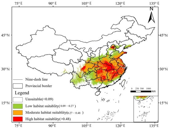 Under current climatic conditions (Figure 5), Ginkgo biloba L.’s potential habitat is primarily concentrated in the Yangtze River Basin, particularly in the lower reaches. The total suitable area accounts for 24.2% of the total land area. The highly suitable area (p ≥ 0.48) covers 508,800 km2, or 21.9% of the total suitable area, and is concentrated in the junction of Hubei, Jiangxi, Henan, and Anhui Provinces, as well as central Sichuan and Northern Guangdong. The moderately suitable area (0.48 > p ≥ 0.27) covers 912,000 km2 (39.2% of the suitable area) and is scattered across central Hunan, north–central Anhui, and most of Sichuan. Low-suitability zones (0.27 > p ≥ 0.09) occupy 892,800 km2 (38.4%), primarily surrounding the medium- and high-suitability zones, with concentrations in Yunnan, Guizhou, and Guangxi. Non-habitable areas are predominantly located in the northwest.