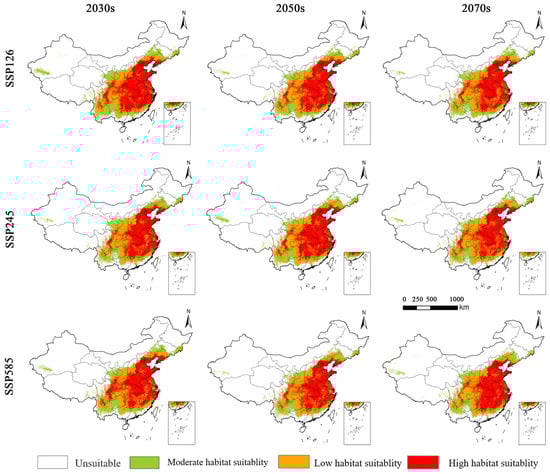 Simulations of future climate scenarios under three shared socio-economic pathways yielded nine potential distribution models for three time periods. The average AUC values of all models exceeded 0.9, confirming the model’s validity. As shown in Figure 6, the area of suitable zones fluctuates under different scenarios (Table 3, Figure 6), with moderate-suitability zones changing little. However, highly suitable areas are predicted to increase dramatically, becoming 2–3 times larger than they are under current conditions. The distribution of highly suitable areas is expected to concentrate and spread northward toward the lower Yellow River. From 2021 to 2040, under scenarios SSP126, SSP245, and SSP585, highly suitable areas are predicted to decrease by 105,600 km2. The largest total suitable area (3.312 million km2) is predicted for SSP126 from 2021 to 2041, while the smallest increase (2.9664 million km2) is expected for SSP585 from 2041 to 2060. Over the next 60 years, the total suitable area is projected to follow the trend SSP126 > SSP245 > SSP585.