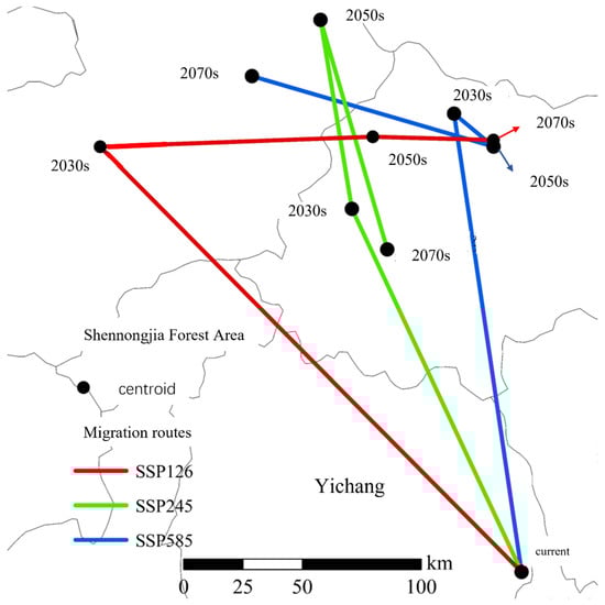 Centroid migration route of suitable areas of Ginkgo biloba L. under different climatic conditions.
