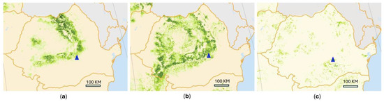 The range of Norway spruce (a), European beech (b), and pedunculate oak (c) species in Romania. A higher intensity of green denotes a greater frequency of species presence [59,60,61]. The blue triangle indicates the location of plots included in dataset 2.