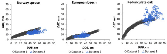 The bark data from the two datasets were subjected to processing, and the values for DBT are presented for the Norway spruce, European beech, and pedunculate oak species in Figure 2 as a function of stem diameter over bark. The point cloud for dataset 1 indicates a nearly linear variation of DBT with DOB for Norway spruce trees. In contrast, the variation of DBT with DOB is slightly curvilinear for European beech trees or can be considered linear in some sections, where the slope evidently changes at least twice around the DOB values of approximately 26.0 cm and 46.0 cm. However, in these sections, the variation is also linear in steps. In the case of the pedunculate oak trees, there is a notable curvilinear trend in the variation of DBT with DOB. In contrast, the point cloud of dataset 2 reflects the DBT variation for shorter DOB intervals and under specific forest site conditions. In the case of the Norway spruce logs, the point cloud is markedly below the DBT values presented in dataset 1 for the DOB sizes between 34.4 cm and 60.0 cm. In the case of the logs of the other two species, the situation is different. The results of the European beech log measurements for the DOB between 14.2 cm and 47.5 cm are largely consistent with the national data. Conversely, recent measurements of pedunculate oak logs indicate that the DBT is higher than the mid-20th century national values, particularly for the DOB sizes above 58.0 cm. It is also noteworthy that the recent measurements of both Norway spruce and pedunculate oak exceed the respective DOB limits of 60.0 cm and 70.0 cm, for which DBT sizes are available in dataset 1.