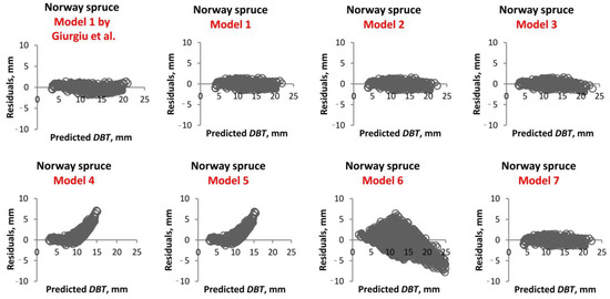 An analysis of the point cloud layout for DBT residuals for Norway spruce (Figure 3) reveals that Models 1–3 and Model 7 yield comparable results. Consequently, the selection of Model 3, based on the evaluation of R2, MAE, RMSE, AIC, and BIC, is substantiated as a reliable decision in light of the observed variation in DBT residuals.